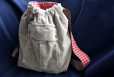 Little Man's backpack is made from one leg of a pair of enormous corduroy cargo pants (See the cargo pocket? It's so nice to have no-work-needed pockets for bags.) and a beautiful blue and brown plaid shirt. I got the pants for about $.050, and the shirt for about $1 at local thrift stores.